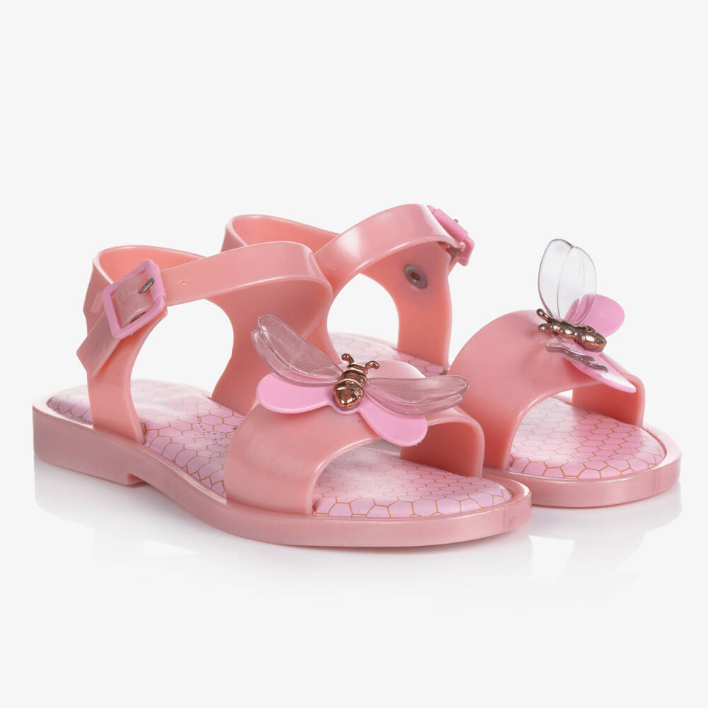 Pink sandals for junior girls by Mini Melissa. They are made in sweet-scented Melflex® PVC, with a sparkly silver bug decoration across the toes. Super comfortable and flexible, these buckle fastening sandals have softly padded insoles and a small heel. There is a non-slip rubber sole for a sure grip.