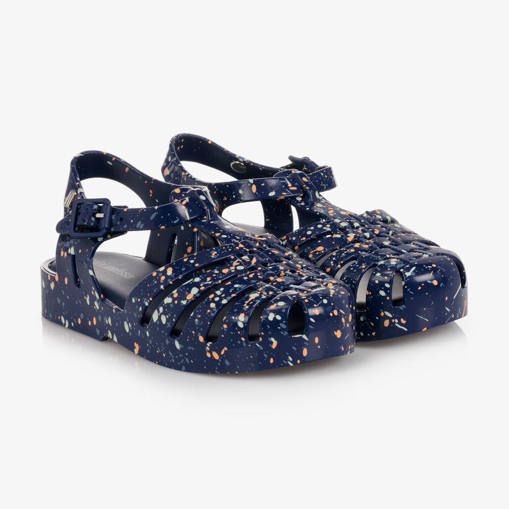 Navy blue jelly shoes for boys and girls by Mini Melissa, made in sweet-scented, soft and durable PVC. They have an orange and green paint splash print and have a velcro fastening strap over the foot. There are comfortable padded inner soles and non-slip outer soles.