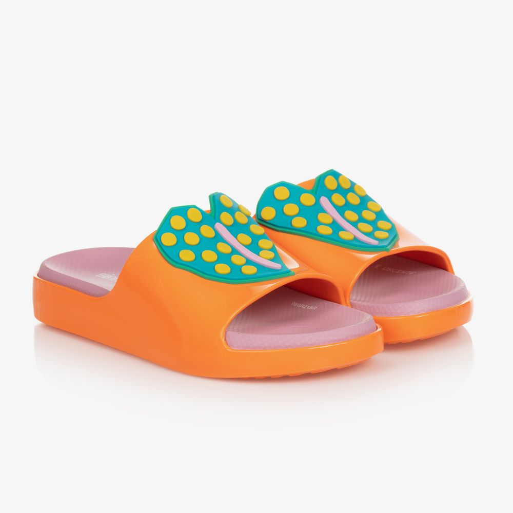 Girls orange jelly Fábula sliders by Mini Melissa, with a green heart on the foot strap. They are made in sweet-scented Melflex®, a recyclable PVC that is both flexible and comfortable. The pink inner soles are moulded for a comfortable fit.