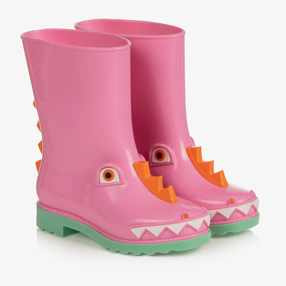 Fun pink scented rain boots for girls by Mini Melissa, made in soft and supple Melflex® PVC. The uppers have a dragon themed design, with eyes, spines and teeth appliques on the toe. They have a soft foam footbed for comfort and a green tread sole for extra grip.