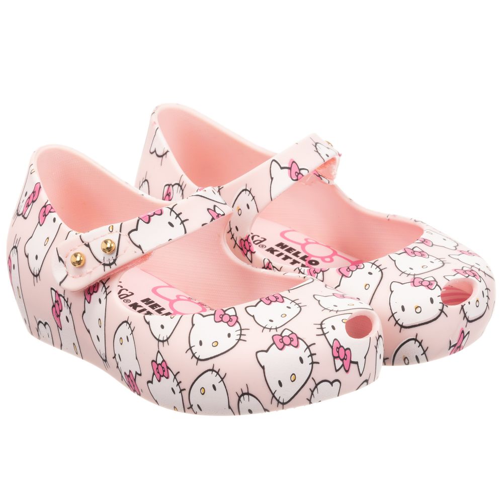 Girls pink jelly shoes by Mini Melissa, with a white Hello Kitty pattern. They are made in sweet scented, soft and durable PVC. The outer soles are flexible and the inner soles are softly padded. There is a hidden wedge heel and signature peep toes, with a velcro strap to fasten.