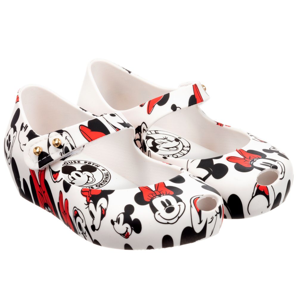 Girls white jelly shoes by Mini Melissa, with a red and black Minnie and Mickey Mouse pattern. They are made in sweet scented, soft and durable PVC. The outer soles are flexible and the inner soles are softly padded. There is a hidden wedge heel and signature peep toes, with a velcro strap to fasten.