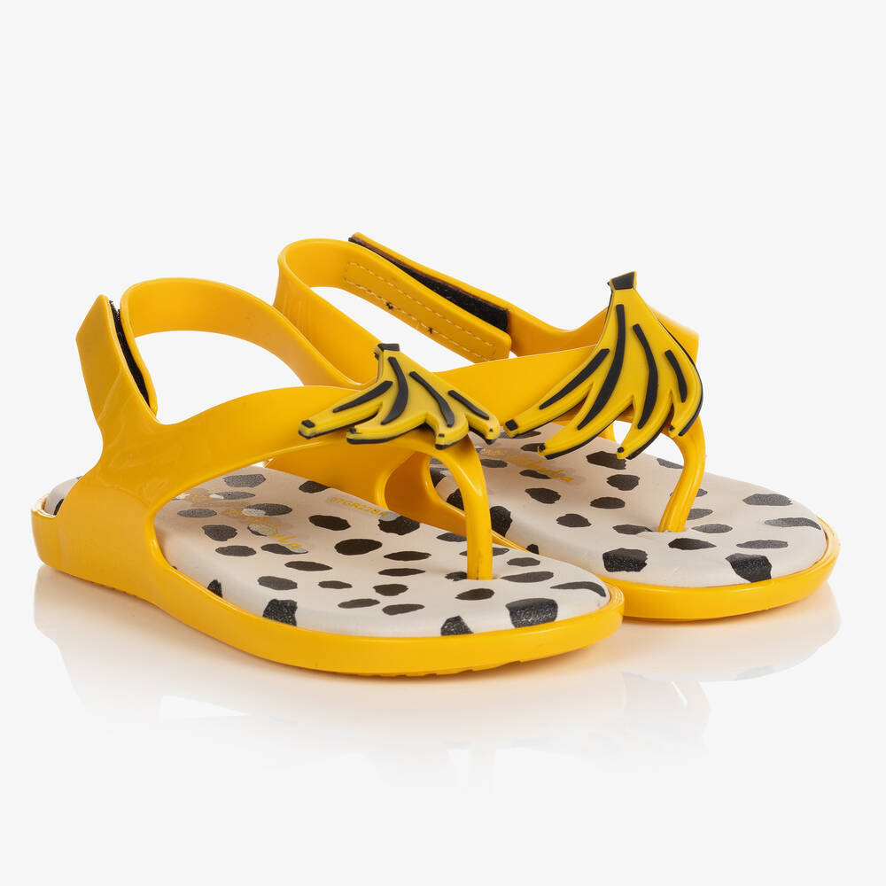 Yellow jelly sandals for boys and girls by Mini Melissa, made in sweet-scented, soft and durable Melflex® PVC. They have a toe post and a white and black patterned softly padded insole, with non-slip outer soles and velcro closing side strap.