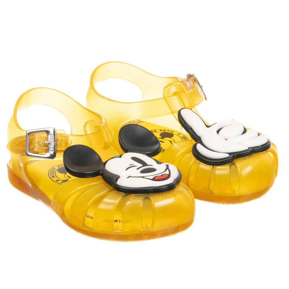 Unisex yellow jelly shoes by Mini Melissa, made in soft PVC with the designer's signature sweet scent. These adorable shoes have a Mickey Mouse logo on one shoe and a thumbs up on the other. They have a comfortable padded footbed, PVC sole and soft velcro fastenings.