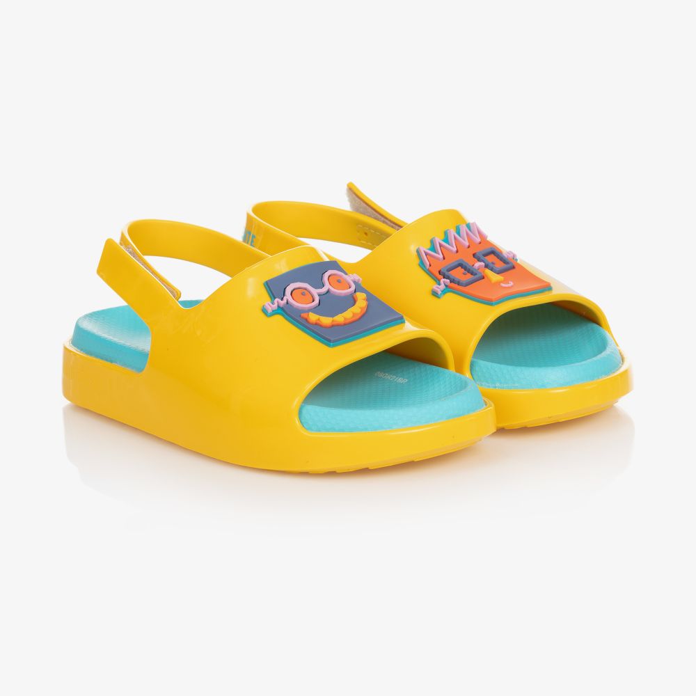Girls and boys yellow jelly Fábula sandals by Mini Melissa, with a colourful face on the toes. Fábula means 'The Fable' in Portuguese and is a brand with a distinct 'Carioca' (from Rio de Janeiro) feel, making it a perfect collaboration with Mini Melissa. They are made in sweet-scented Melflex®, a recyclable PVC that is both flexible and comfortable. The blue inner soles are moulded for a comfortable fit and there is a velcro fastening strap on the back.