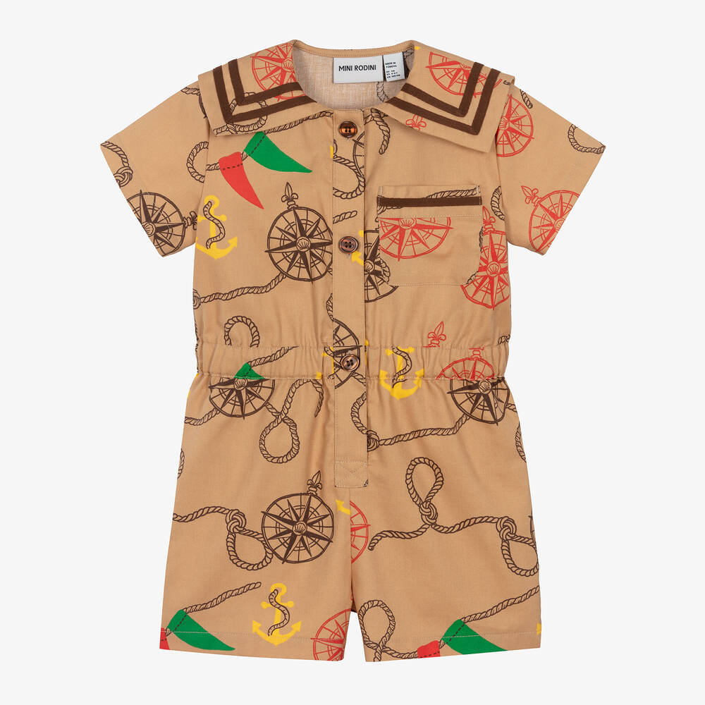 Beige organic cotton playsuit for boys and girls by Swedish brand Mini Rodini. It has a fun nautical print highlighted in yellow, red and green, with a sailor-style collar trimmed in brown, matching the trim on the chest pocket. Ideal for warm days, it is made in comfortable, lightweight twill with short sleeves and a stretchy, elasticated waist. There are button fastenings on the front.