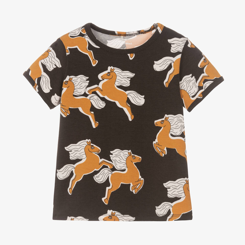 Little girls and boys washed black T-shirt by Mini Rodini, made in soft organic cotton jersey. Cute and casual, it has a relaxed crew neck and a playful tan brown horses print all-over.