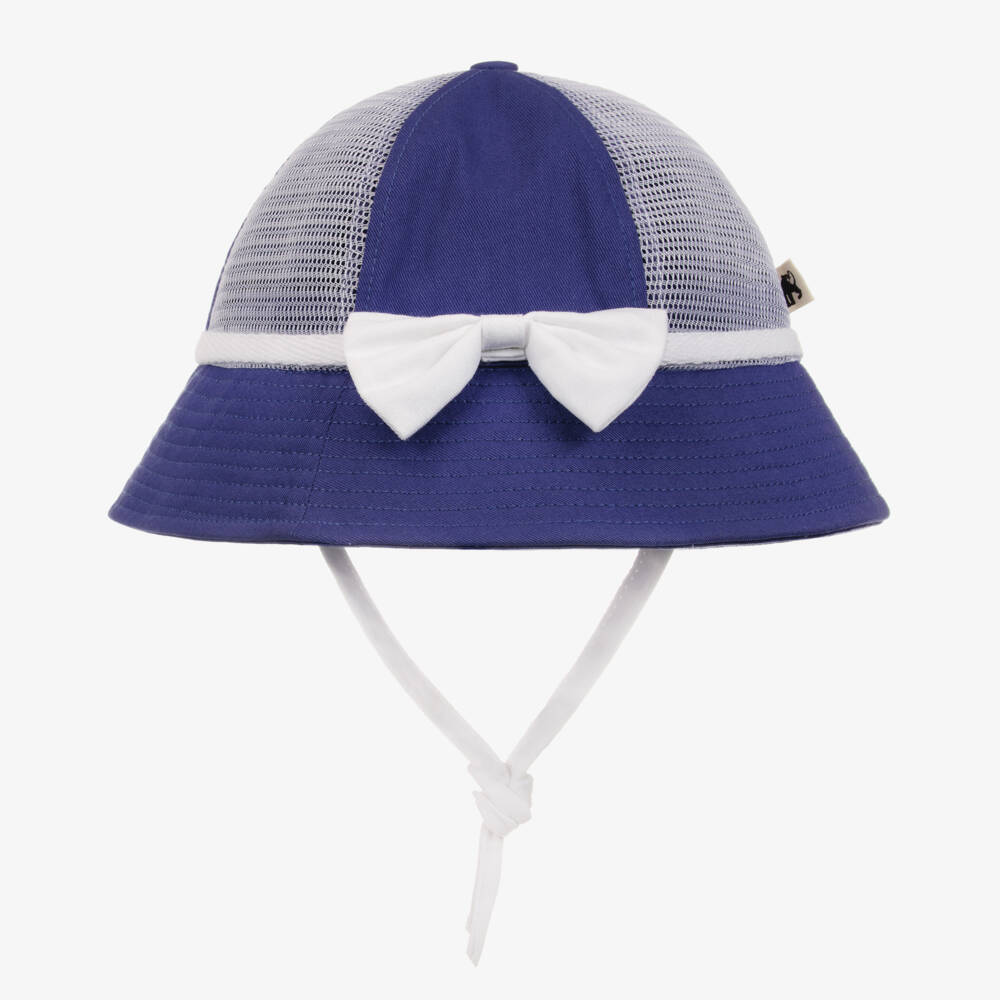 Indigo blue sun hat for girls by Mini Rodini, with a white bow on the front. It is made in soft cotton twill and has white mesh inserts. There are ties to secure under the chin.
