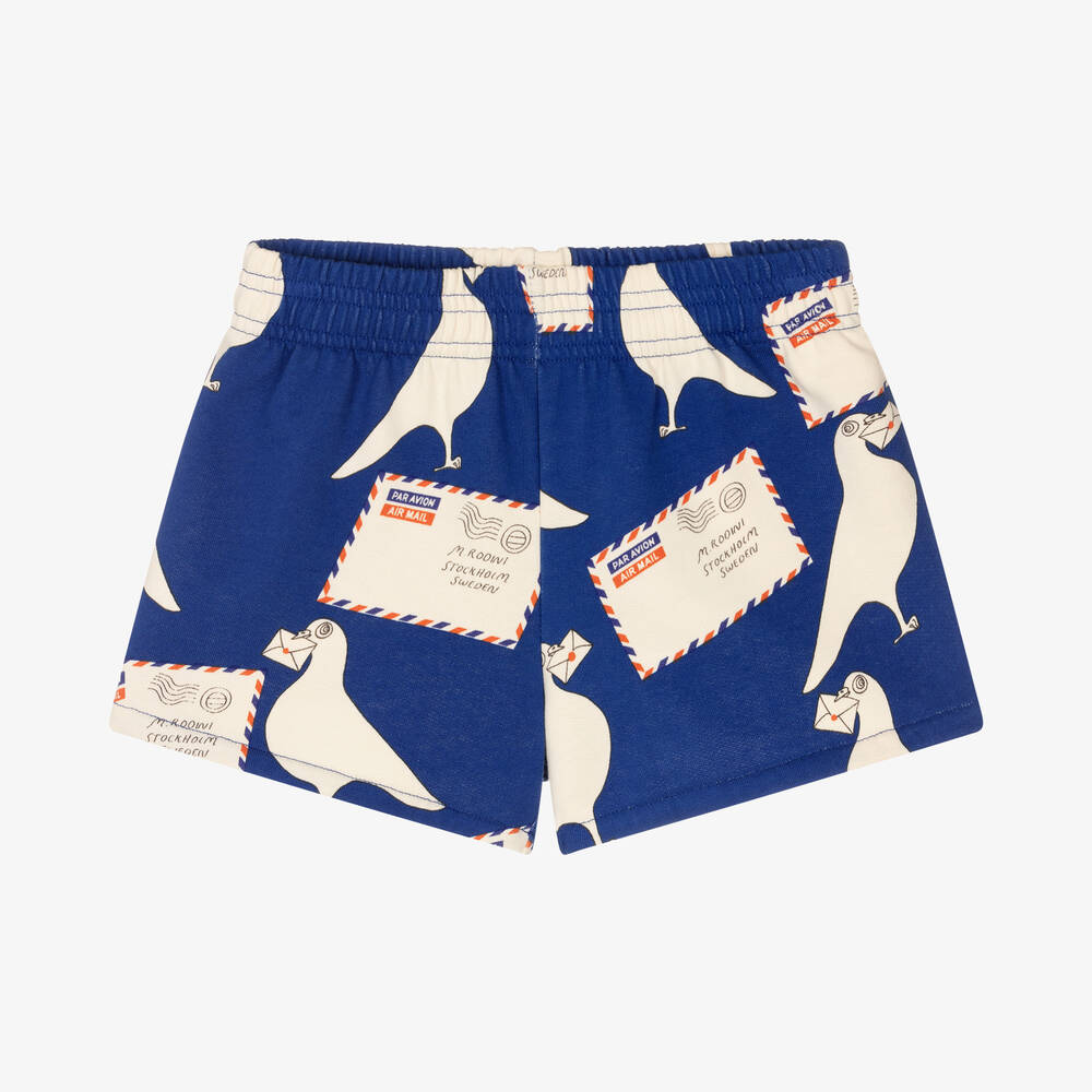 Cobalt blue shorts for boys and girls by Swedish brand Mini Rodini, made from soft organic cotton jersey. Vibrant in style, these casual shorts are designed in an all-over pigeon print. The flying envelopes are bordered with blue and red stripes for an extra pop of colour. They have a comfortable, elasticated waist with drawstring ties for a good fit.