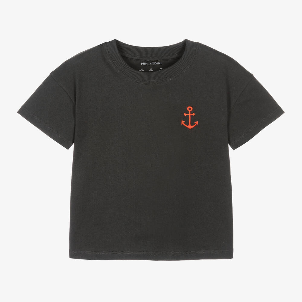 An organic cotton T-shirt for boys by Swedish label Mini Rodini, in a cool, washed-effect tone of black. With a ribbed neckline and dropped shoulders, this boxy-fit T-shirt has a red anchor embroidered on the front for a quirky take on the classic nautical aesthetic.