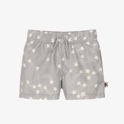 Cool black swim shorts for boys by Mini Rodini, patterned with yellow shooting stars. Silky smooth, they are made from recycled material with a soft mesh lining and a drawstring on the waist for an adjustable fit. The brand's black panther tab gives them a signature touch.