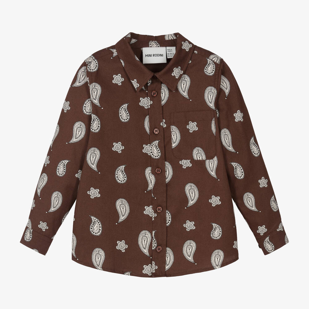 Long-sleeved brown shirt for boys by Mini Rodini, made in organic cotton twill. Styled with button fastenings and a chest pocket this lovely shirt is patterned with an ivory Paisley print for a trendy retro finish.