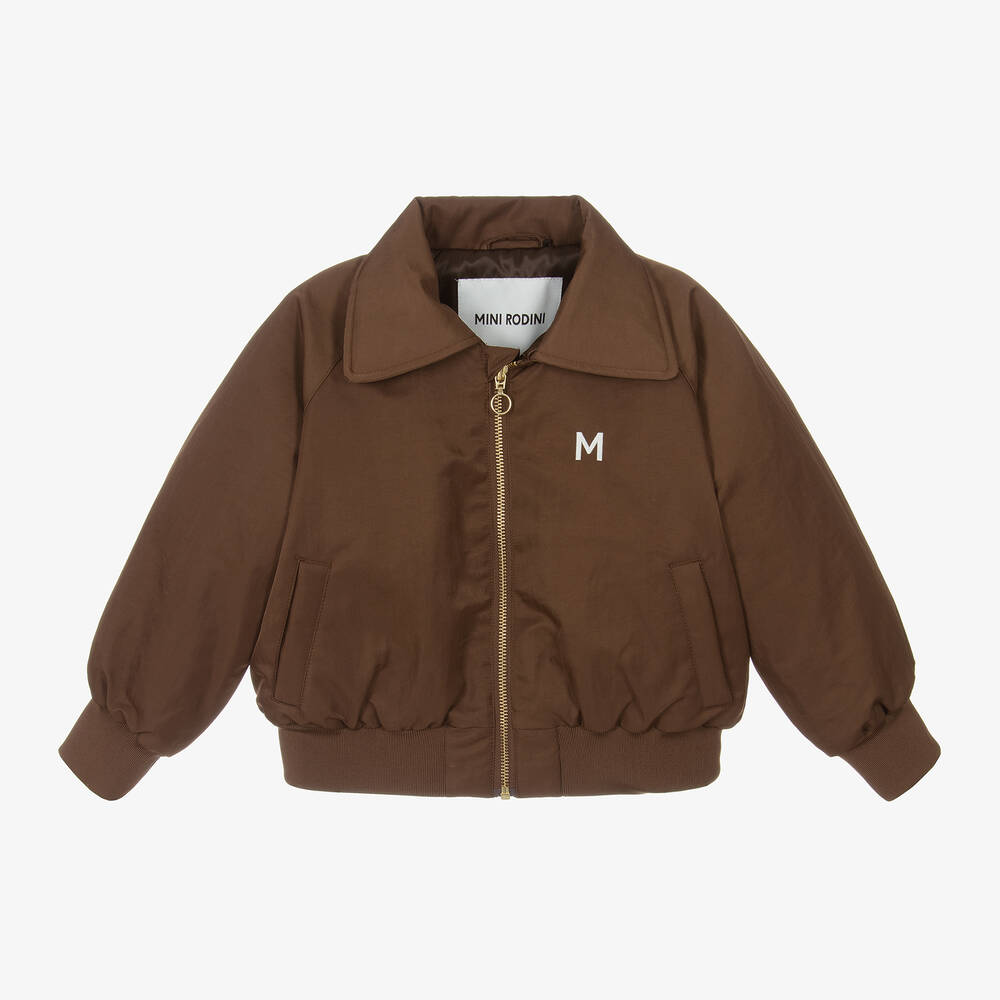 From Mini Rodini, brown bomber jacket for boys and girls. Made in silky smooth, water-repellent fabric this warm jacket is finished with cartoon cats on the back in a style synonymous with the brand.