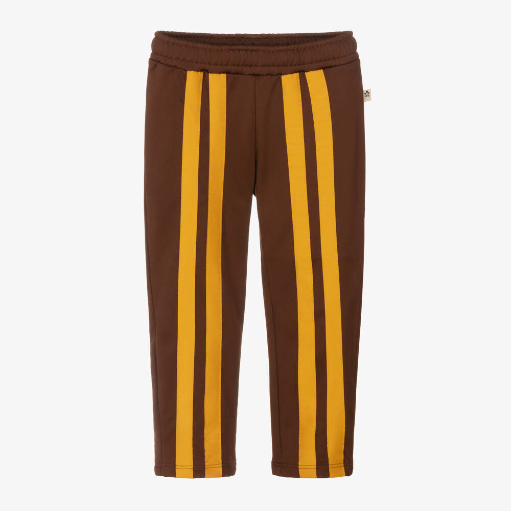 Brown joggers for boys and girls from Mini Rodini, made from a soft and silky recycled jersey. For a cool, sporty look they have mustard yellow taped trims down the front of each leg. There is a small logo tab on one side seam and an internal drawstring on the elasticated waistband to ensure a comfortable fit.