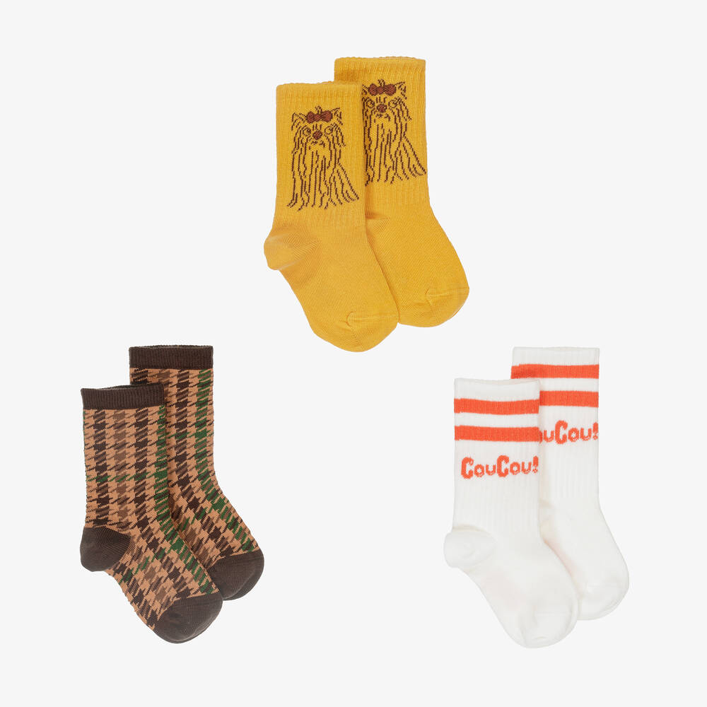 Three pairs of ankle socks for boys and girls by Swedish brand Mini Rodini, made in a soft organic cotton blend. The mustard yellow socks have a cute dog motif and the brown pair have a smart houndstooth pattern. The final white pair are detailed at the top with an orange stripe 'CouCou!' design. Each pair have a logo underfoot for a signature finish.