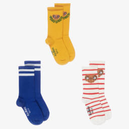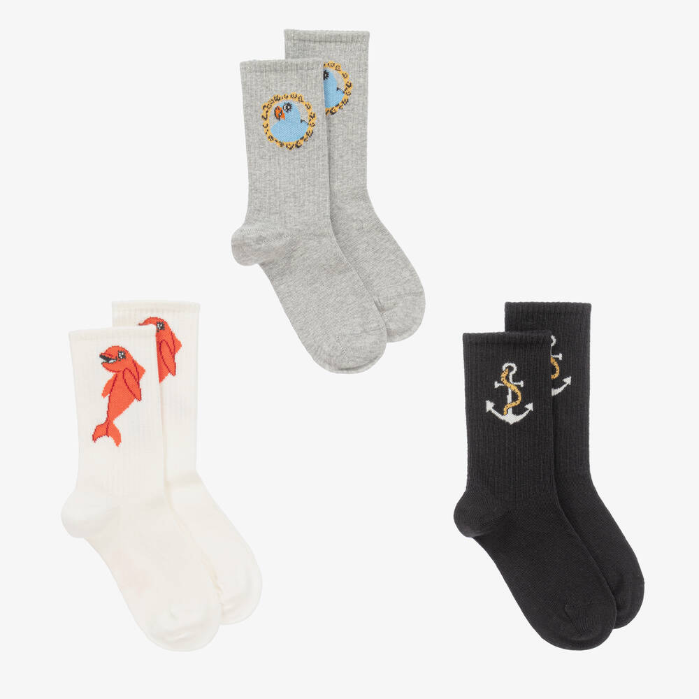 A fun three-pair pack of socks for boys and girls by Swedish brand Mini Rodini. The navy blue pair features anchor and snake motifs, the yellow pair has blue and yellow parrot motifs, and the ivory pair has red dolphins. All pairs are made in a soft and stretchy cotton blend, with the designer's name underfoot.