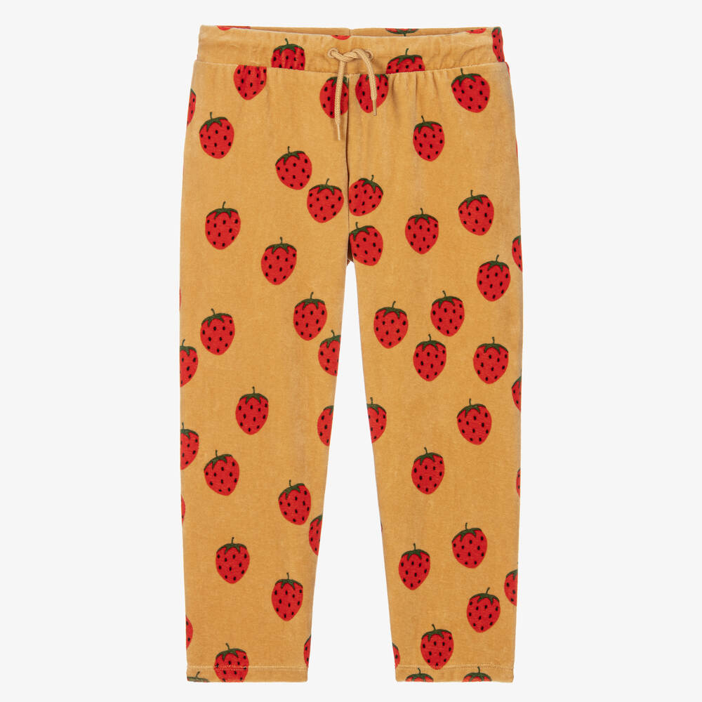 Fun beige trousers for girls by Mini Rodini, made in super soft organic cotton velour. Fantastic for adding a touch of personality to their wardrobe, these playful bottoms have an all-over red strawberry print. Still placing importance on comfort, they are finished with an elasticated drawstring waist.