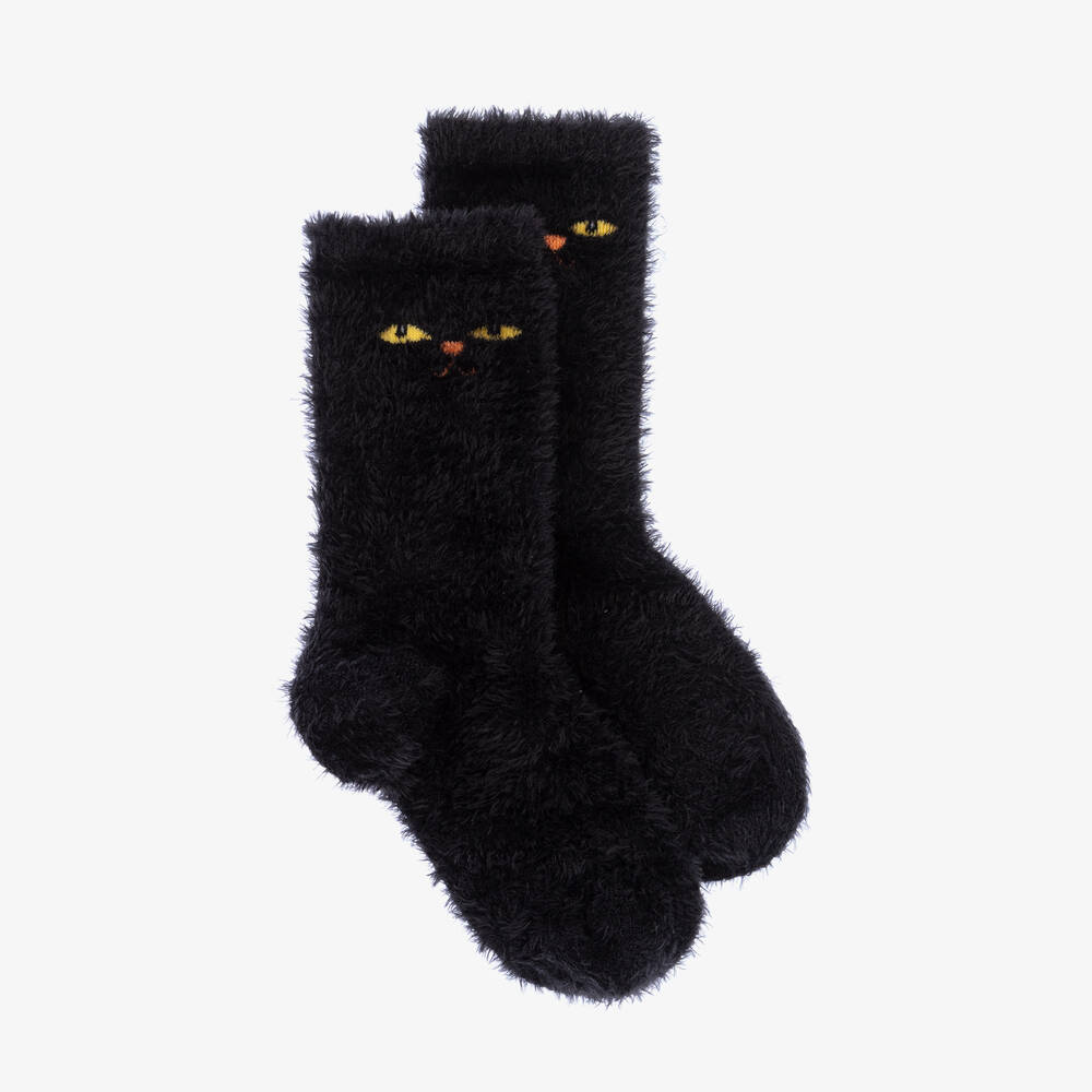 Adorable black ankle socks for girls by Mini Rodini, knitted in a super soft and fluffy fabric. Each ankle has a playful yellow and orange cat face in an intarsia style knit, adding a quirky touch to all outfits they are paired with.
