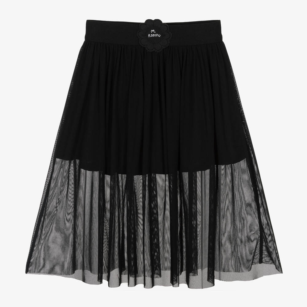 Stylish black skirt for girls by Mini Rodini, made in sheer, recycled tulle. The shorter-length lining sits above the knee and is made in soft organic cotton jersey. The elasticated waist is decorate with sweet black flower, stitched with the designer's name in the centre in white.