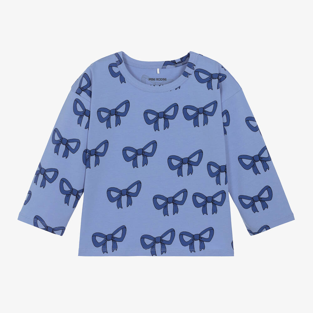 A cornflower blue top for girls by Mini Rodini, made in soft and stretchy organic cotton jersey. This long-sleeved top has a round neckline and dropped shoulder seams. It is printed with bow graphics in a darker shade of blue for a fun and playful look.