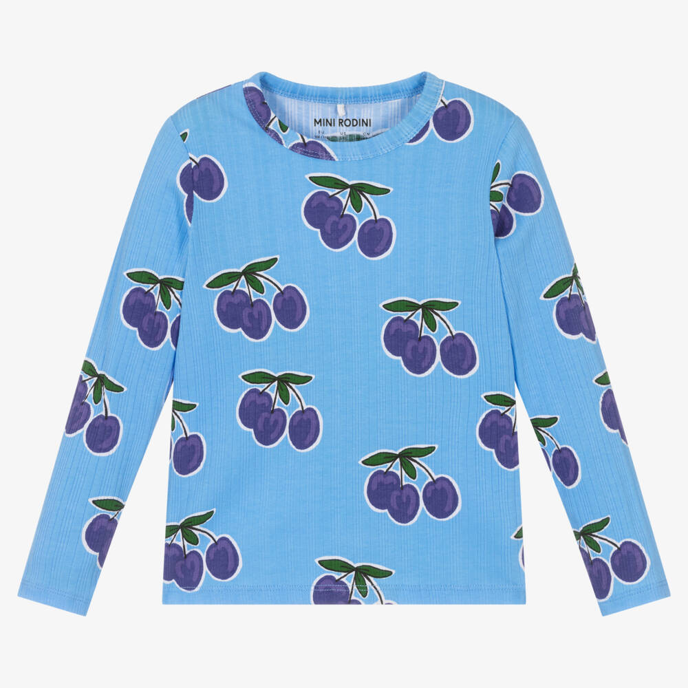 Lovely blue long-sleeved top for girls by Mini Rodini, with a bold plum print in purple and green. This useful wardrobe essential is made in super soft organic cotton jersey with a ribbed texture.