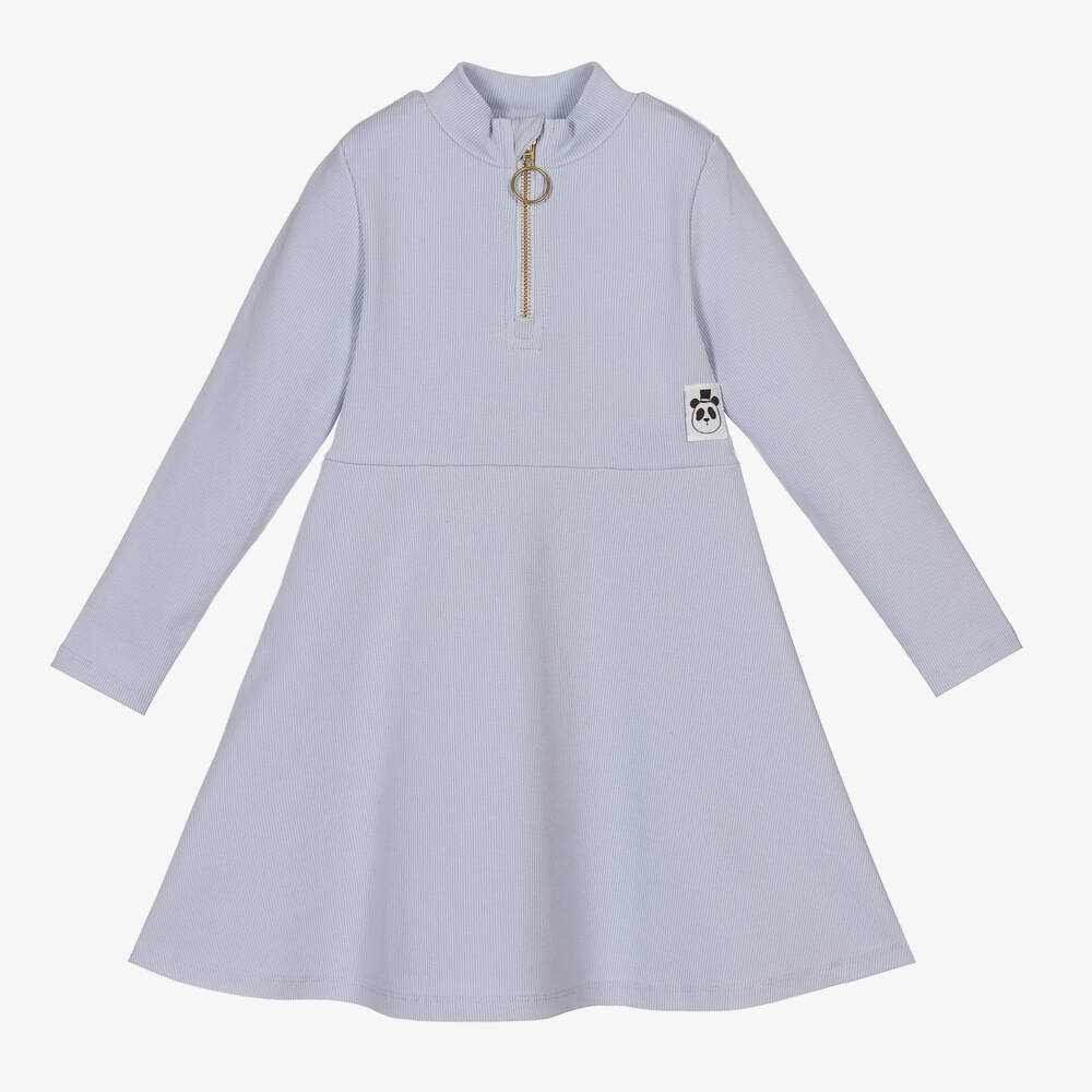 Cornflower blue high-neck dress for girls by Mini Rodini, made in ribbed organic cotton jersey. Embroidered with a cute panda logo badge on the bodice, this A-line dress has a contrasting shiny gold zip on the front and a full skirt.