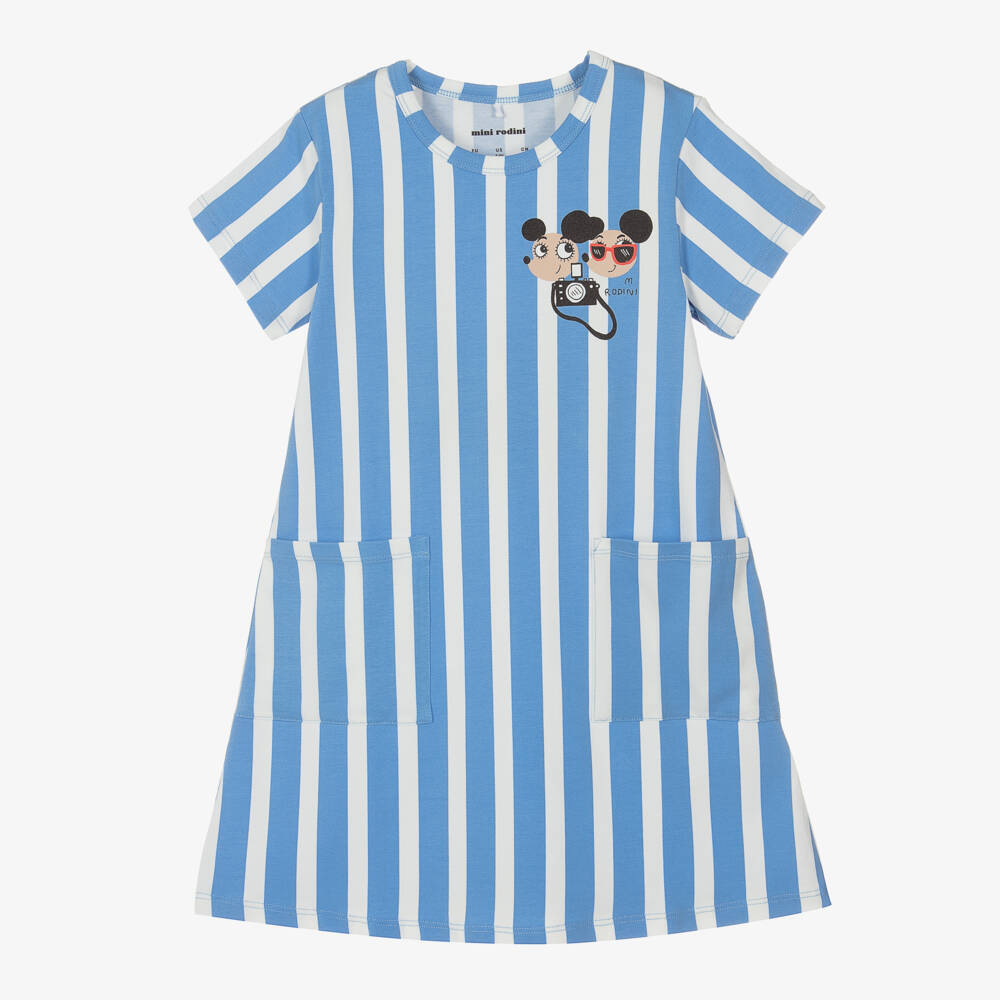 Boldly striped in blue and white, this comfortable T-shirt dress for girls is by Swedish brand, Mini Rodini. Made in soft organic cotton jersey, it has a slightly A-line shape and patch pockets on the front. The chest is stamped with the designer's fun Ritzratz characters and a camera logo graphic.