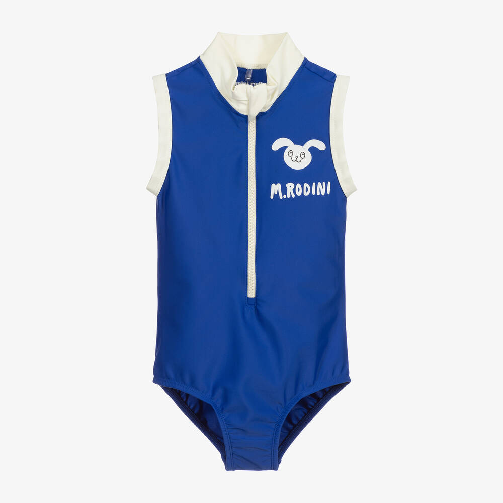Girls blue swimsuit by Mini Rodini, made in recycled polyester with a zip up front. It has a white rabbit print, and ivory trims around the sleeves and neckline.