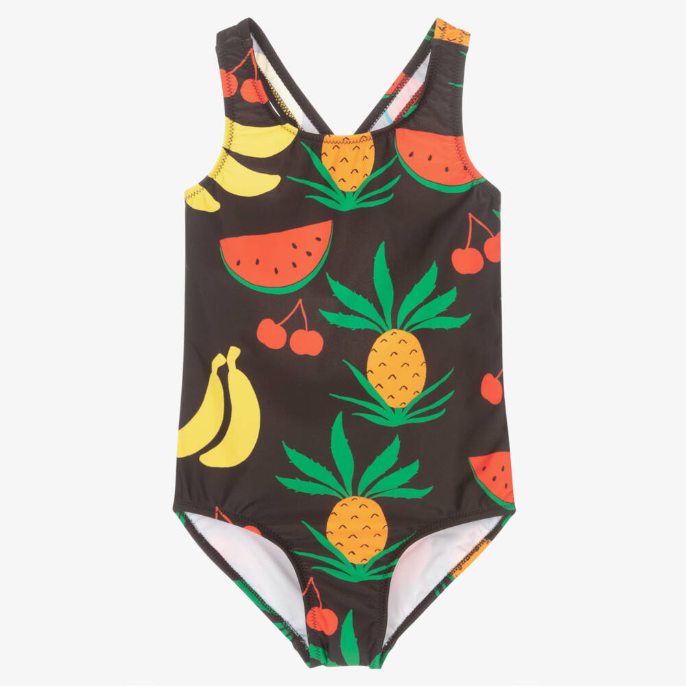 Fun brown swimsuit for girls by Mini Rodini, made in soft and stretchy recycled nylon with UPF50+ protection. Patterned with a colourful fruit print, it is fully lined for comfort and has a stylish scoop back with crossover straps.