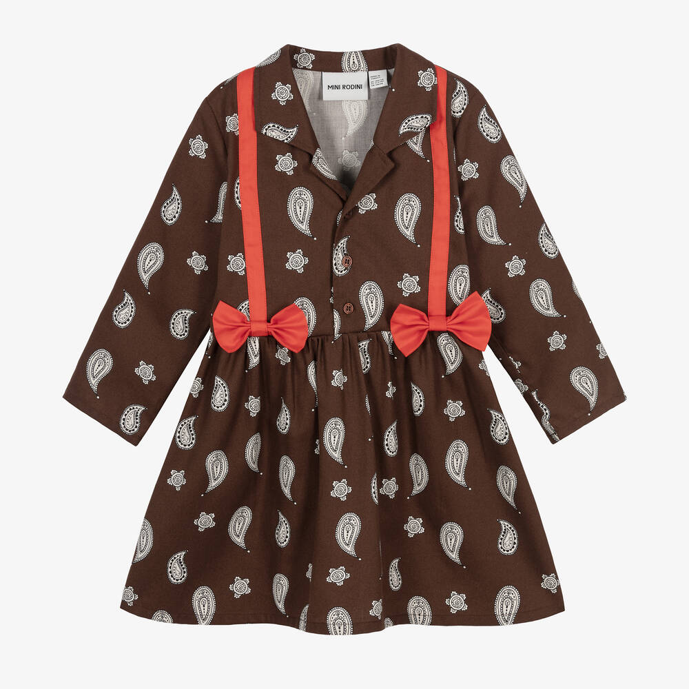 Brown dress for girls by Mini Rodini, made in organic cotton twill. Patterned with a gorgeous ivory Paisley print, this lovely dress has a button-down shirt style top and a gathered skirt for easy movement. Two bright red ribbon stripes and bows on the front add an eye-catching finish.
