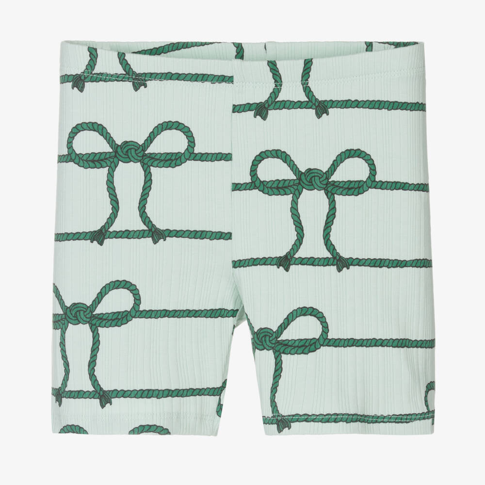 Mint green cycling shorts for girls by Swedish brand Mini Rodini, made in soft and stretchy organic cotton jersey for comfort. These casual shorts have a lightly ribbed finish and a fun rope bow pattern in a darker shade of green.