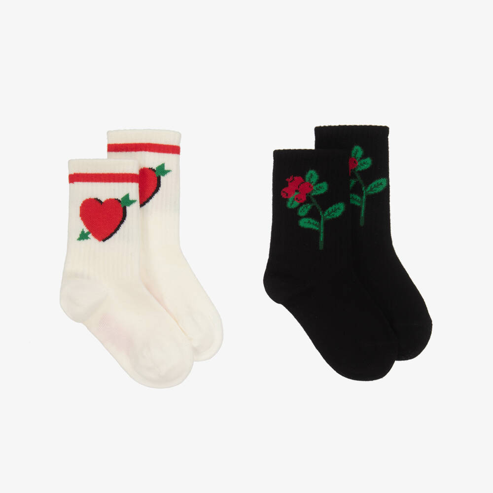 Ivory and black socks for girls by Mini Rodini, made with organic materials. Sold as a pack of two, these comfortably stretchy socks have different designs on the ankle, including an arrowed heart and a lingonberry plant. The M.Rodini logo can be seen under foot.