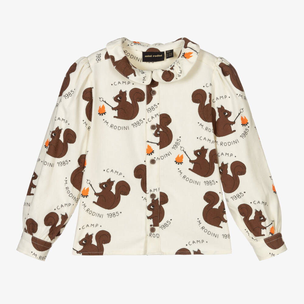 Ivory flannel shirt for girls, by Mini Rodini. Made in soft organic cotton flannel, it has a brown camping squirrel pattern with the brand's logo printed all-over, and a pretty high neck ruffle collar.
