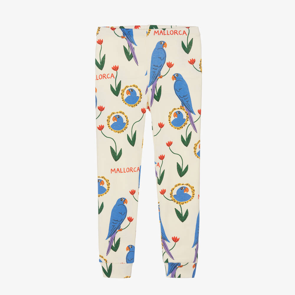 Organic cotton full-length leggings for younger girls by Mini Rodini, in ivory and accented with blue, orange and red. The Swedish brand, inspired by the Spanish island of Mallorca, has designed these characterful leggings with florals and little parrots gazing into their reflection. The soft jersey fabric, elasticated waist and ribbed cuffs provide long-lasting comfort.