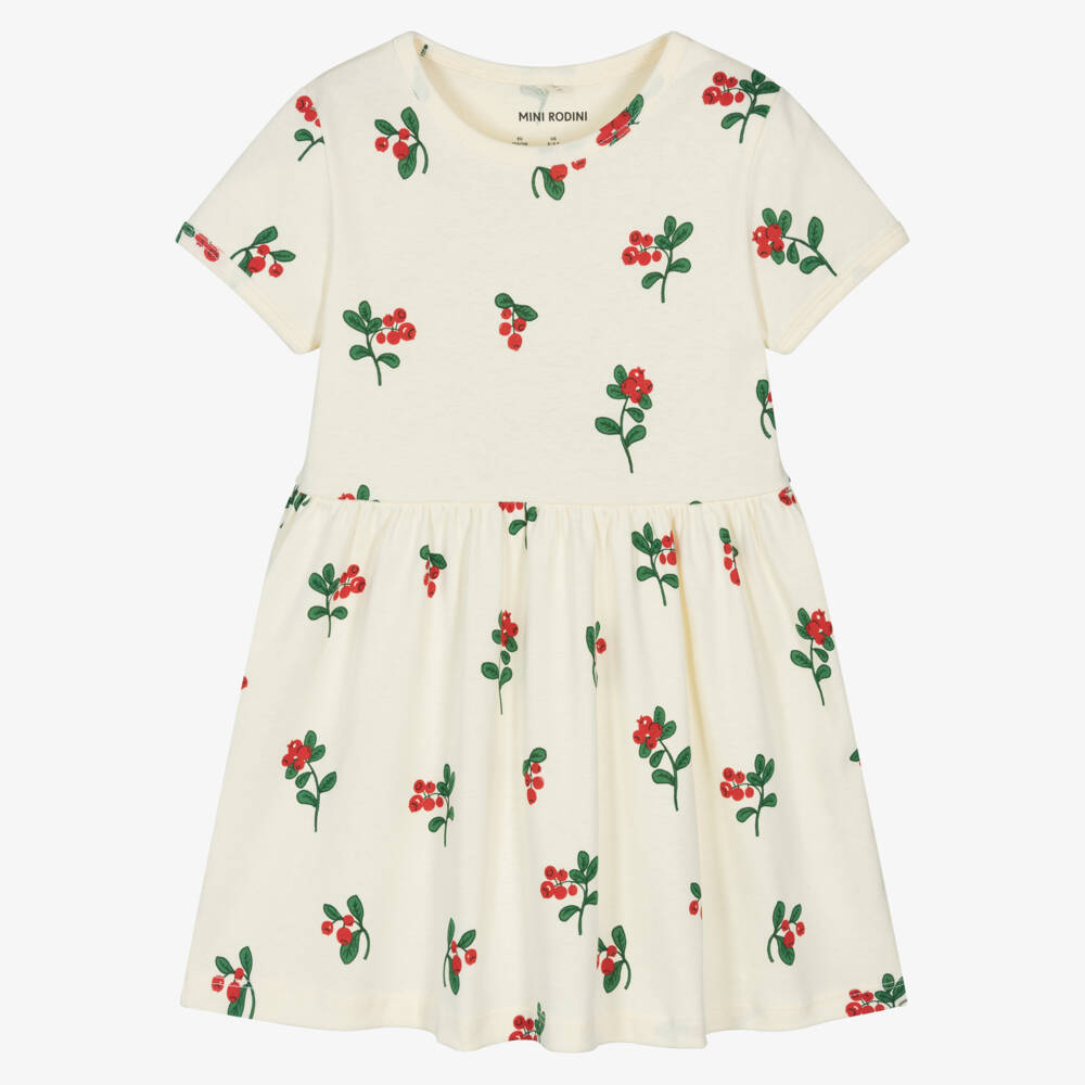 Beautifully patterned with red and green lingonberries, this ivory dress for girls is from Mini Rodini. A classic, casual style, it is made in soft organic cotton jersey and slips easily over the head.