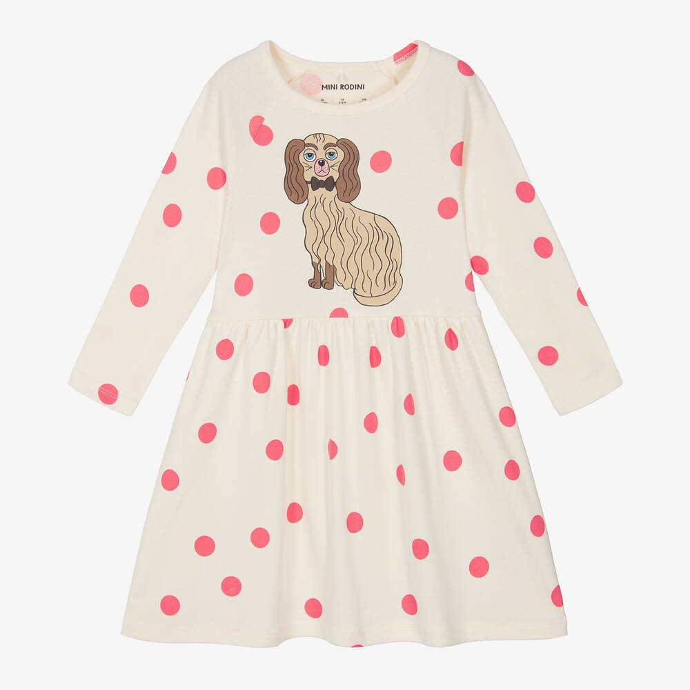 A casual, ivory organic cotton jersey dress for girls by Mini Rodini, patterned with lovely pink polkadots. It has an adorable beige and brown dog with a bowtie printed on the front. It has raglan sleeves and pulls over the head easily.
