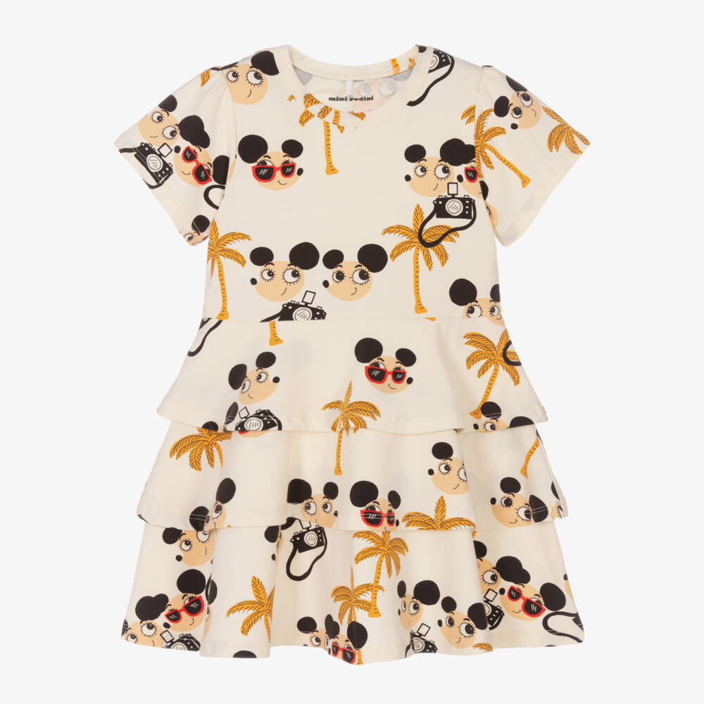 Ivory organic cotton dress for girls by Mini Rodini, made in soft, stretchy and comfortable jersey. In an on-trend dropped-waist design, this cool dress is decorated with the Swedish designer's fun Ritzratz characters on holiday. The skirt is layered in tiers for a fun flowy style, great for twirling and dancing. The short sleeves are gathered on the shoulder for a feminine puff effect.