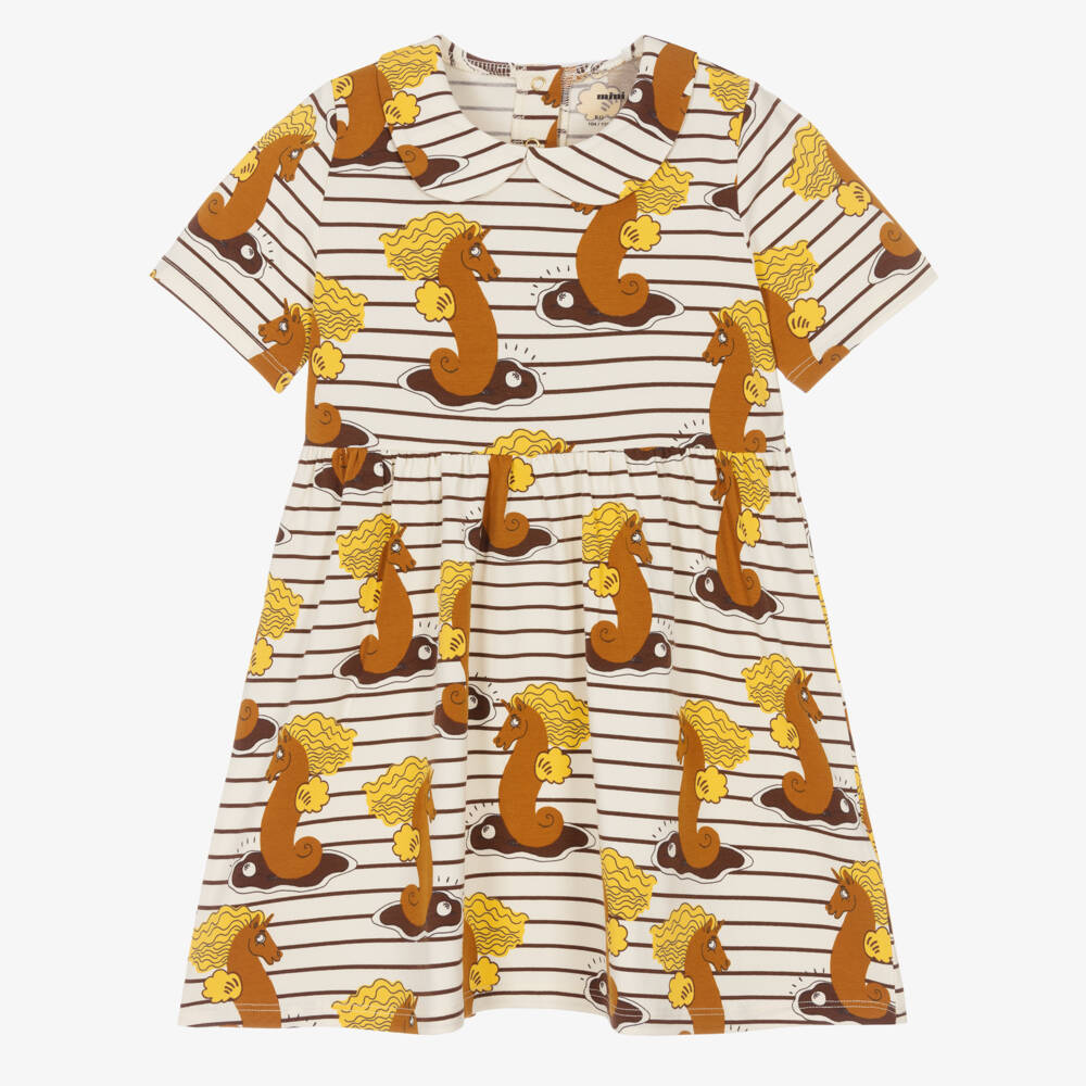 A ivory dress for girls by Mini Rodini, made in the softest organic cotton jersey. In a brown stripe design, this quirky dress is printed with unicorn seahorses. It has a Peter Pan collar and easy-to-fasten poppers on the back.