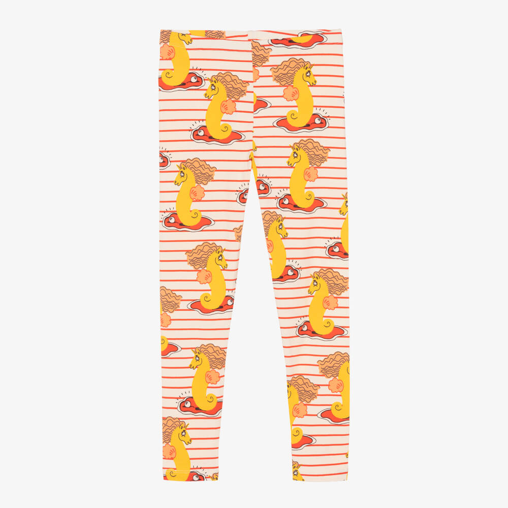 Ivory leggings for girls by Mini Rodini, made from soft and stretchy organic cotton jersey. Fun and imaginative, these leggings are patterned in red stripes with yellow unicorn seahorses.