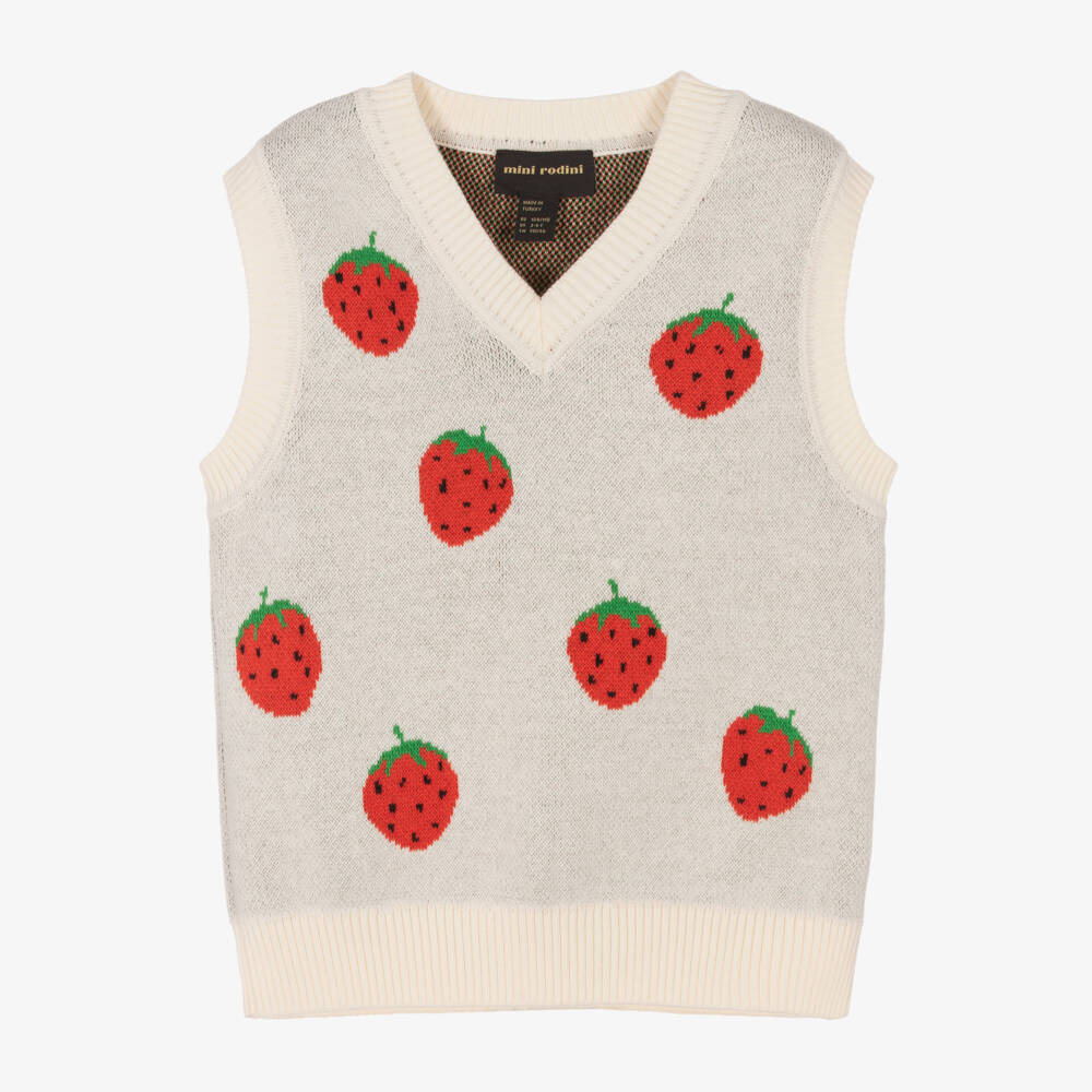 Ivory sleeveless sweater vest for girls by Swedish brand Mini Rodini, made in a soft, organic cotton knit. This fun slipover is designed in an all-over red strawberry intarsia pattern for a fun finish. It has comfortable ribbed edging and a v-shaped neckline for classic styling.
