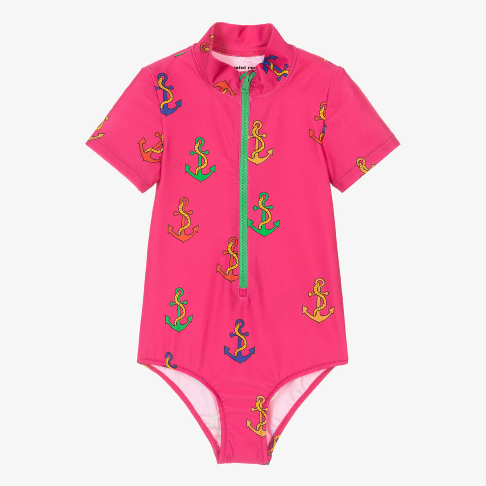 Pink swimsuit for girls by Mini Rodini, made from silky, stretchy recycled fabric with a UPF of 50+. In a nautical-inspired anchor print, this fun one-piece has short sleeves and a high neckline. The style is designed with a green zip-up front to help with dressing.
