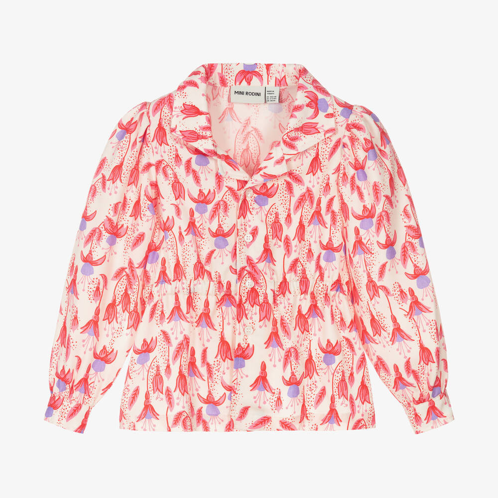 Pretty pink blouse for girls from Swedish brand Mini Rodini. Made in mid-weight Lyocell with a gathered elasticated waist, this lovely shirt offers comfort and style. For easy dressing, it fastens with buttons on the front and is printed with a bright fuchsia floral print for a playful finish.