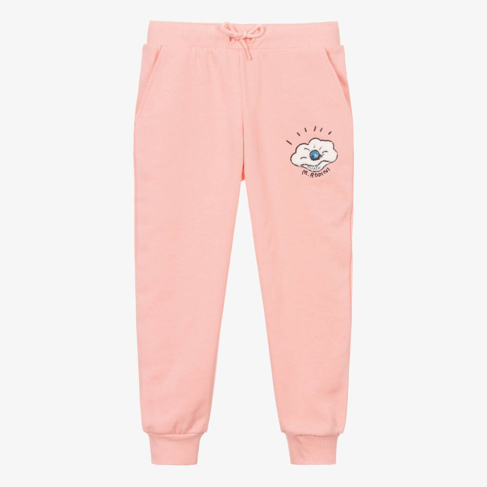 Fun pink joggers for girls by Swedish brand Mini Rodini, made in mid-weight organic cotton jersey. Designed with comfort in mind, these casual bottoms have slanted front pockets and ribbed trims. The drawstring waist can be easily adjusted for a secure fit. There is a cute white oyster and pearl motif on one leg with the designer's name embroidered below.