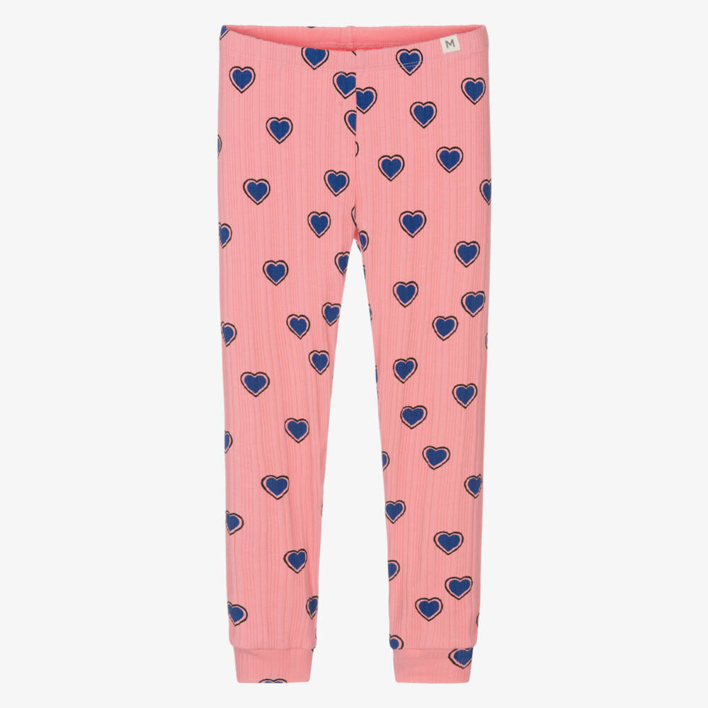 From Mini Rodini, a pair of pink cotton leggings for girls with a fun blue heart print. Made in soft stretchy ribbed jersey, these comfortable leggings have an elasticated waist for a secure fit.