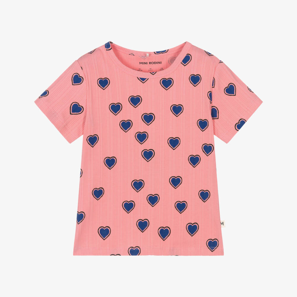 A pink cotton T-shirt for girls from Mini Rodini, made in soft stretchy jersey. This cool and comfortable tee is printed with blue hearts for a playful finish.
