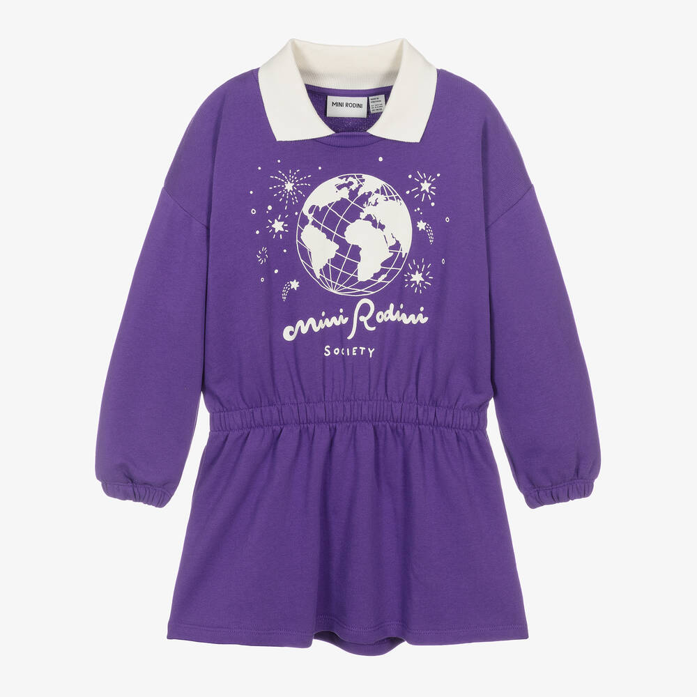 Bright purple organic cotton dress for girls by Mini Rodini. This mid-weight jersey dress has an elasticated waistline and cuffs for comfort. The front is printed with an off-white global and "mini Rodini society" and a contrasting collar gives a fun finish to this casual dress.