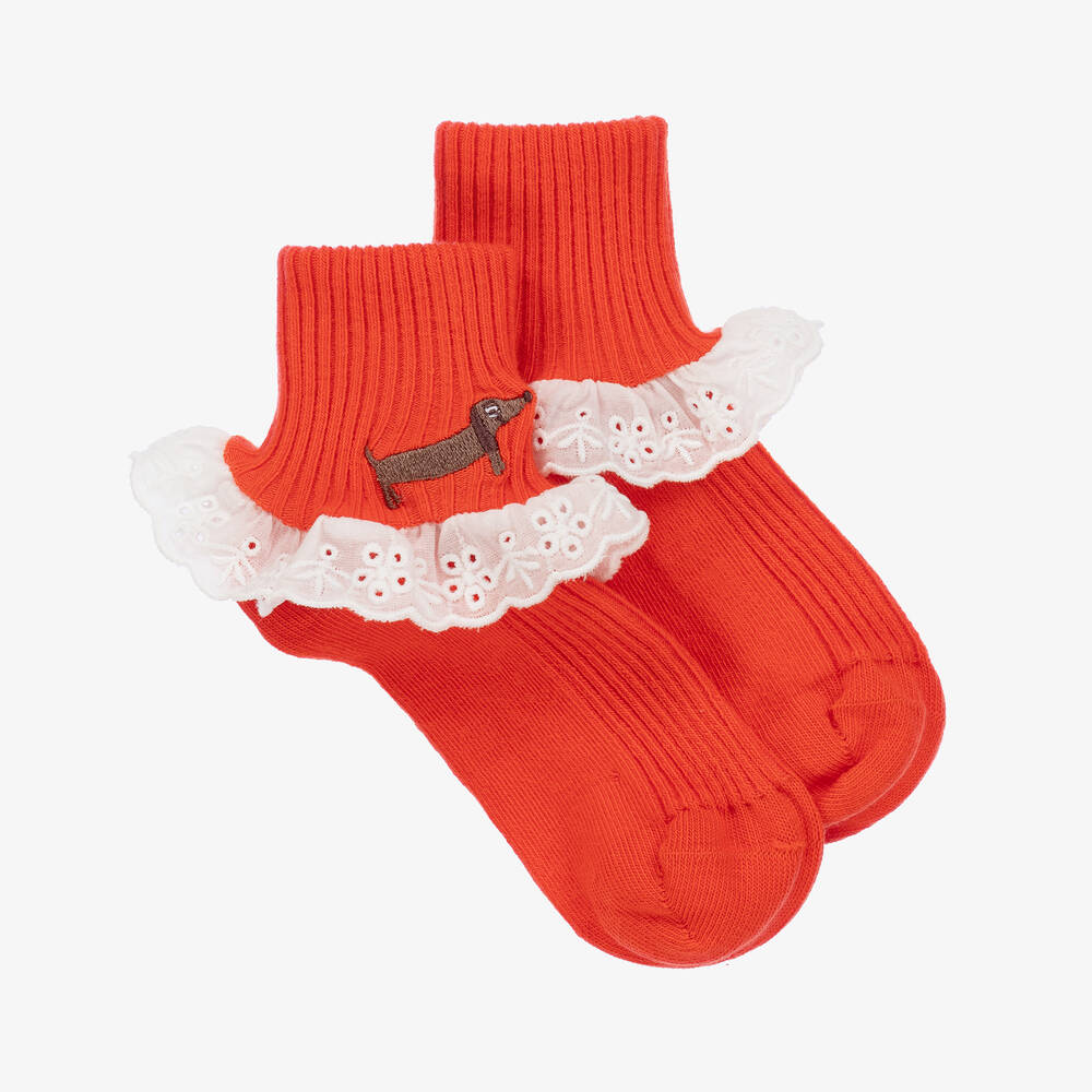 A pair of red-orange ankle socks for girls by Swedish brand Mini Rodini, made in a soft and stretchy organic cotton blend. Embroidered with an adorable dog in brown, these cute socks are trimmed with a white broderie anglaise ruffle for a pretty finishing touch.