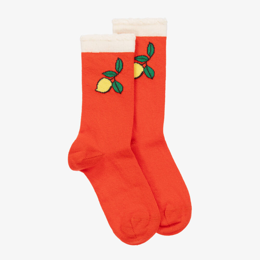 Lovely bright red socks for girls by Mini Rodini, made in a soft organic cotton blend. Trimmed with ivory picot detailing around the ankle, they have a bright intarsia lemon sewn on both sides of each ankle to add a playful touch to any outfit.