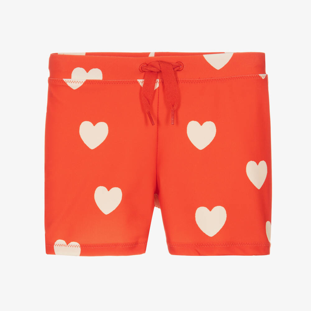 A standout beach and poolside look for girls, these bright red swim shorts from Mini Rodini are patterned with ivory hearts. Made from silky, stretchy ECONYL fabric with UPF50+, they have an elasticated waistband with adjustable drawstring ties.