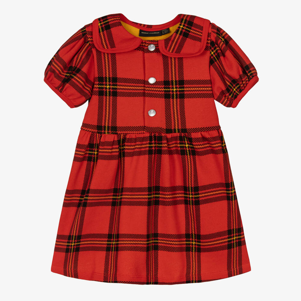 Inspired by the Scottish highlands, this lovely red tartan dress for girls is by Mini Rodini. Casual and comfy, it is made in soft organic cotton jersey, with pretty puffed sleeves and pearlised button fastenings on the front.